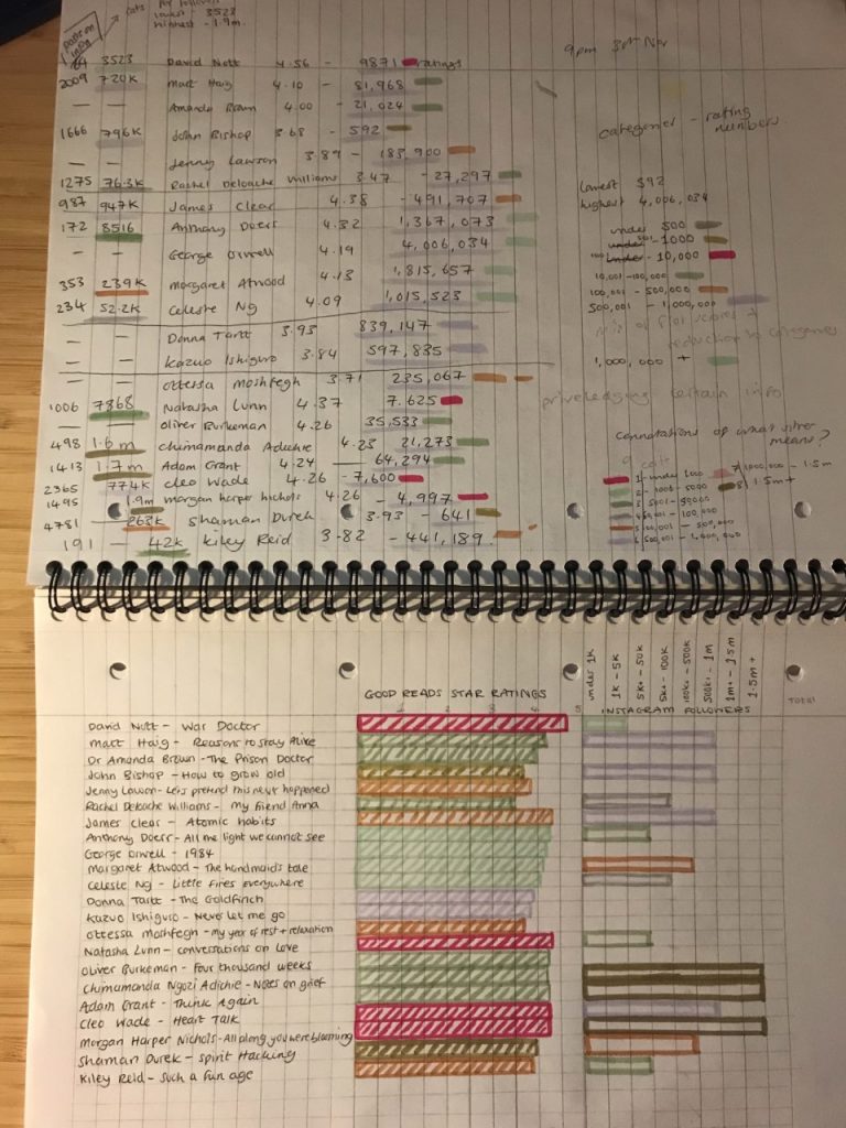 To represent whether the book holds knowledge considered useful to wider society, my visualisation places Instagram followers as a proxy metric for societal impact, omitting nuance as to why or who values those voices related to what is being taught (or recommended in the case of goodreads). This notion of value to society is highly applicable to ‘Bildung’, (van Dijck et al, 2018) as education to enhance the common good. This questions how platforms such as goodreads enact their values and how this influences the recommendation process. The profit-based nature of technology development appears in juxtaposition of this but prevails as part of the socio-technical assemblage involved in teaching with data. The reliance and commodification of data in education is discussed by Williamson et al (2020) as ‘dataism’: routed in the neoliberalist focus on marketisation and performance measurement.