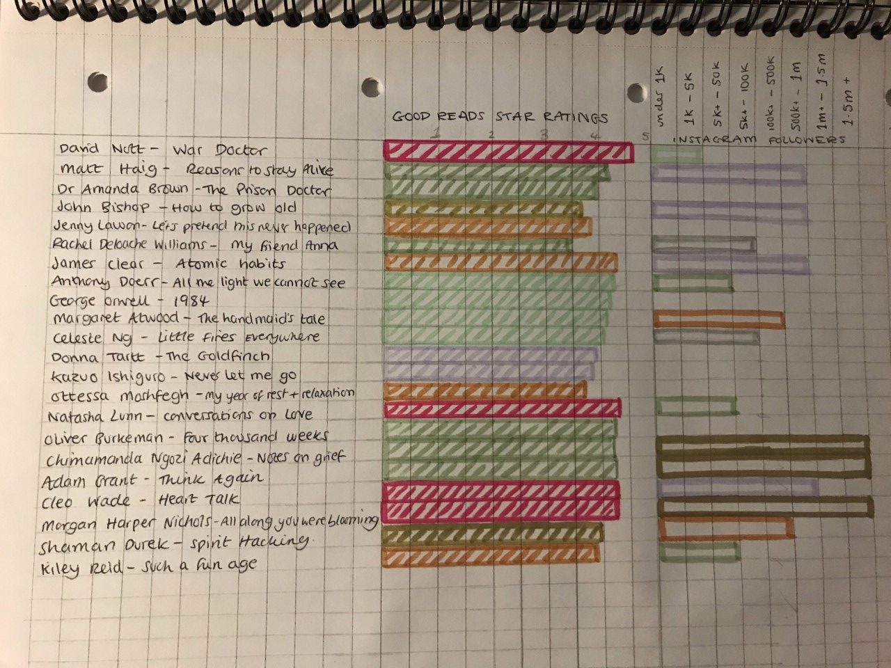 The implied aim of goodreads to evoking the practice of reading rather than tracking knowledge built, which could be argued as similar to the phenomenon of teaching increasingly being seen as a role of facilitation. The assumption of meaning also extends to a lack of data: in my visualisation a few of the authors do not have Instagram and the gaps feed into the risk datafication carries of ‘pedagogic reductionism as only that learning that can be datafied is considered valuable’ (Williamson et al, 2020, P358).
