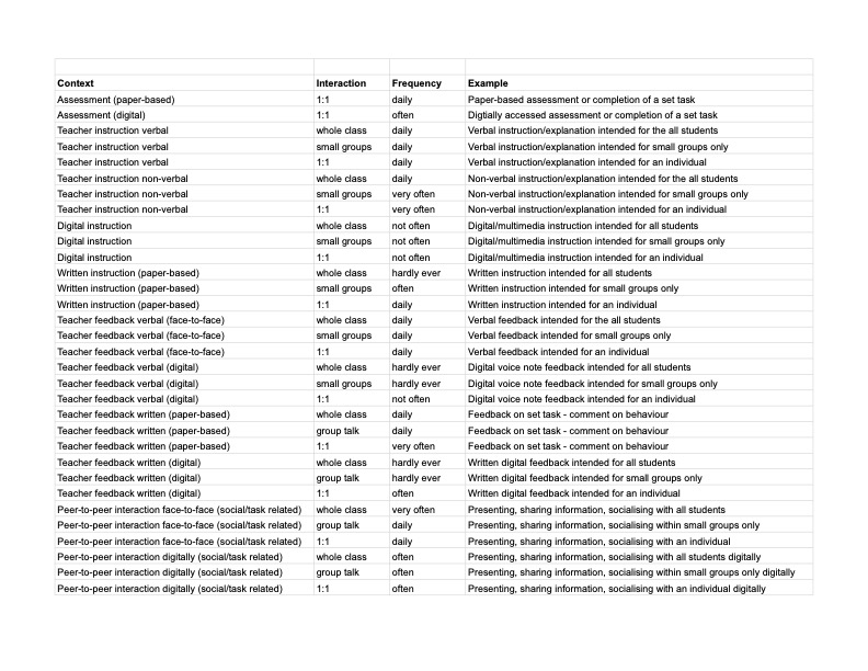 I started by listing the types of interactions in my classroom. From teacher-led to peer discussion, I also noted the (potential) frequency of these moments. While only some exchanges have been listed here, I wanted to document how often students might interact digitally. If a live learning dashboard were to be created, data from such digital platforms could prove helpful.