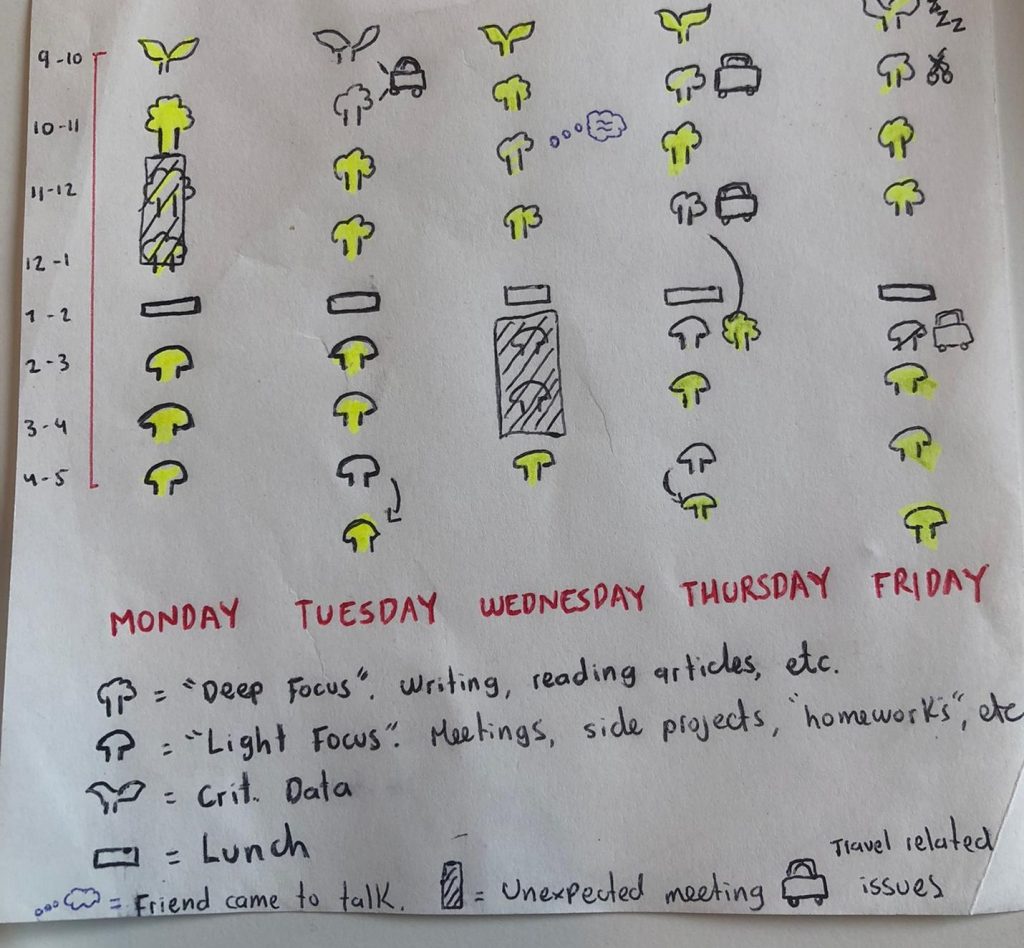 I wanted to experiment with the idea that data-driven technologies influence educational activities and have the power to frame learners’ choices and decisions (Knox, Williamson & Bayne, 2019). Of course that we are not talking about sophisticated data-intensive practices, but just a piece of paper. However, this piece of paper had the power to act as a normative model for my week as a learner. It is very telling to witness that it still had a big impact on my experience last week. As mentioned by Bulger (2016), personalized learning tools that rely on data usually gather information about the student and analyze it against ideal models of performance, or against the performance of other students. I believe that in a smaller scale, my experiment had the same effect of setting a concrete yet powerful idea of what being a good student means, and such idea governed my actions, my experience and my outcomes during one whole week. Even when I was not nudged to comply with my schedule -a common technique to influence students’ behavior taken from behavioral psychology-, the ideal schedule of a student was constantly in the back of my mind and, in that sense, the time I spent could only take the form of either time well spent (i.e. time complying with my schedule) or time wasted (i.e. time doing something else).