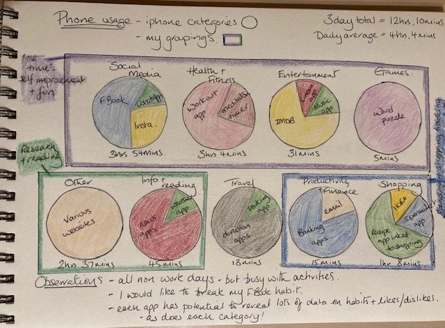 My previous visualisations have been illustrated in days, with the findings for each day being recorded by volume/instances etc. For this task I wanted to think about the information a little differently, though some of this was done for me as the iPhone automatically categorises apps used into categories. I opted for a circle to represent each category with the content of the circle reflecting the app usage. I found the categories logical however there were other ways to divide up the data so I grouped them a little differently, according to my preferences.