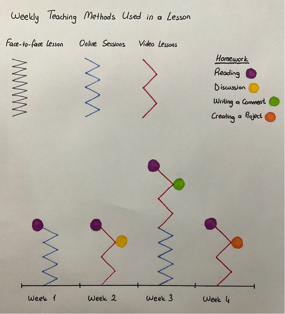I created a data visualisation about “Weekly Teaching Methods Used in a Lesson”. I tried to differentiate the teaching and the learning part from this perspective; the points I used in my data are methods decided by teachers as a way of teaching. The zigzags represent the way of teaching and the coloured circles are the homework types. The distance between the zigzag lines represents the distance between the student and the teacher. In face-to-face lessons, there are more frequent lines in zigzag. As a summary, I created a visualisation for understanding the variety of methods used in a lesson during a period of time.