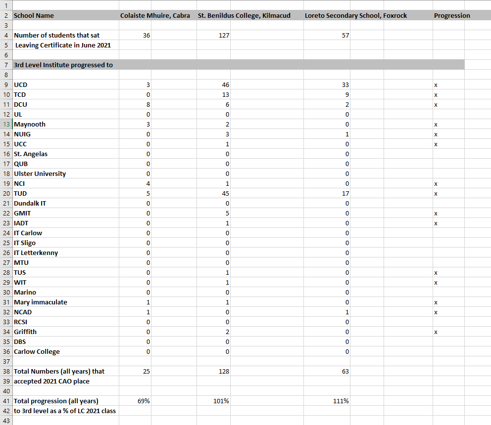The data was taken from the most recent Irish Times feeder schools league tables published on January 7th 2022, available here.