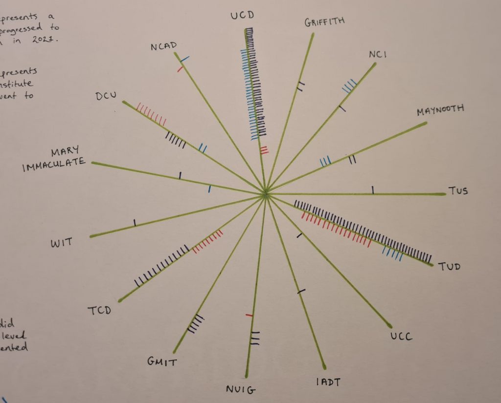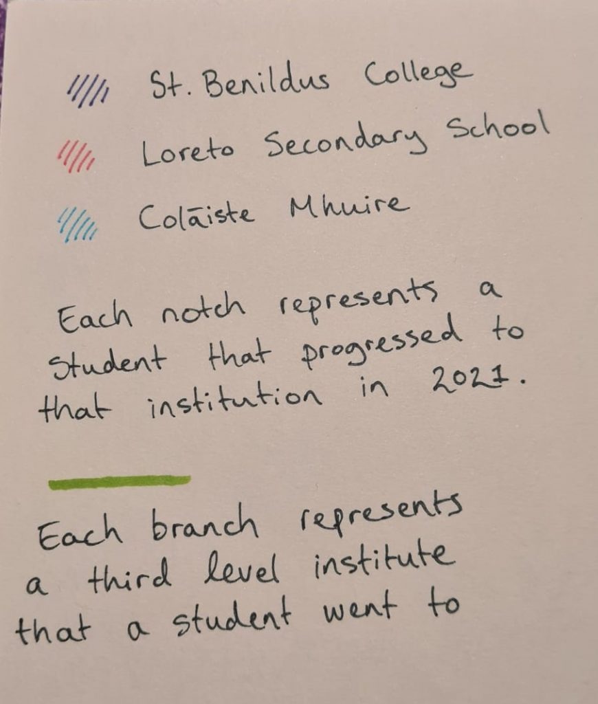 I opted for a ‘tree’ style diagram to represent the students that progressed to third level, with a branch for each of the 15 institutions that the students from the three schools progressed to.