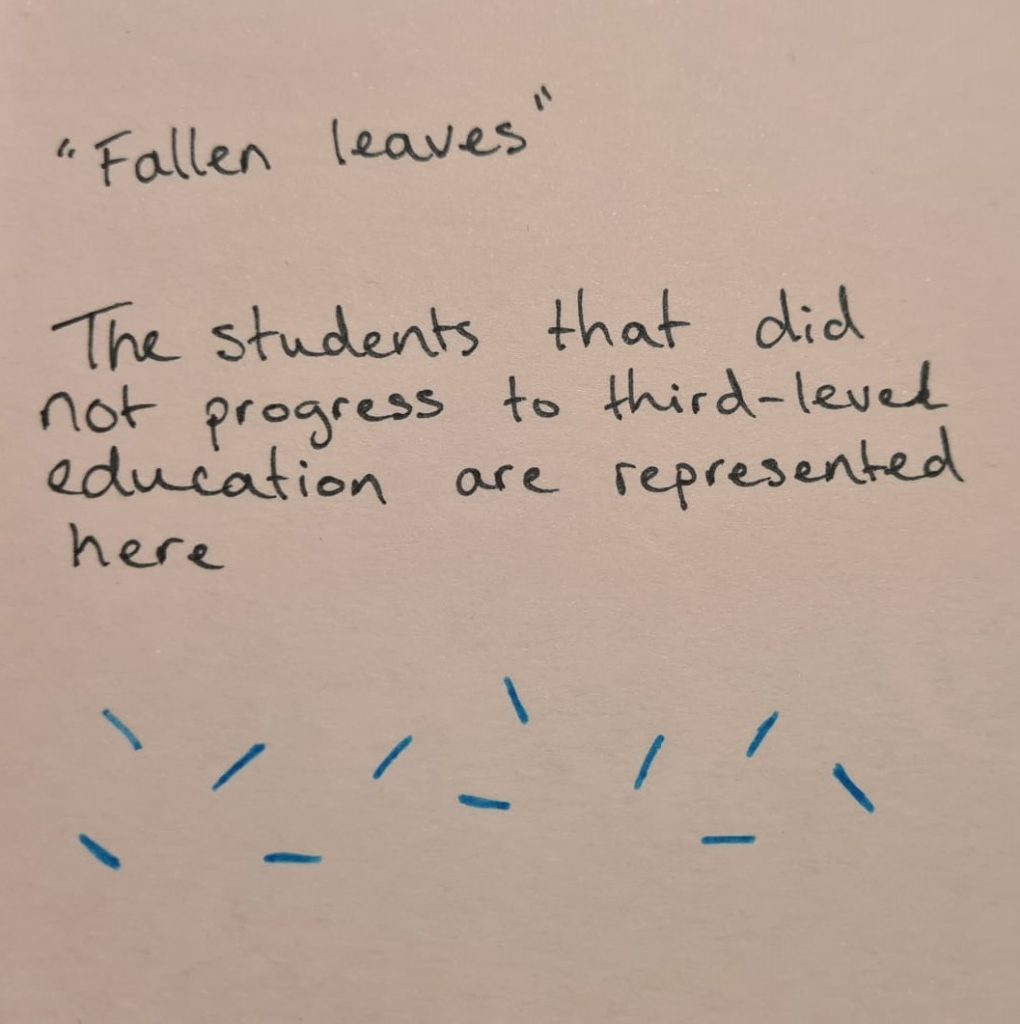 I attempted to include the ‘forgotten’ students as fallen leaves at the bottom of the tree to show that they are not represented in the data. I did not have any data available on what these students progressed to after leaving school, only that they did not attend any third level institutions accounted for in the league table.